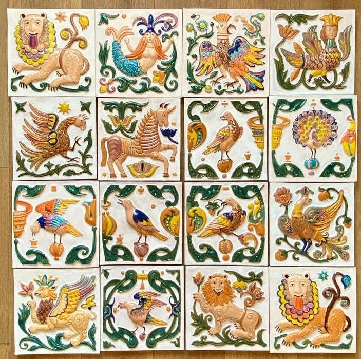 Изразцовая фасадная цветная плитка из серии "Древние символы". Размер каждого изразца 25см на 25см. В 1 кв.м. - 16 шт. Стоимость доставки рассчитывается отдельно, исходя из итогового веса изделия. Ручная авторская работа. Рекомендации по монтажу изразцов Основное применение: