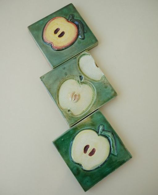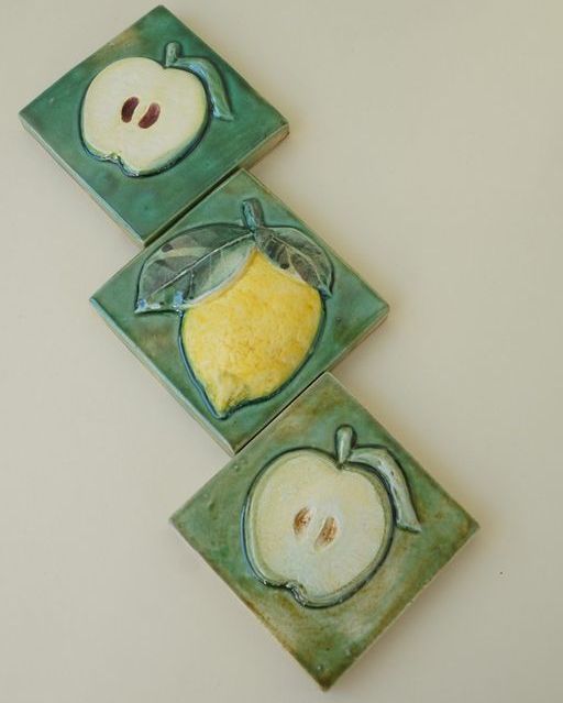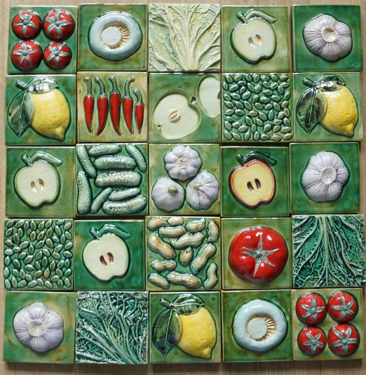 Изразцовая цветная плитка из серии "Дивный урожай". Размер каждой изразцовой плитки 9см на 9см. Толщина: 0,8-1см. В 1 кв.м. - 124 шт. Всего 13 видов.